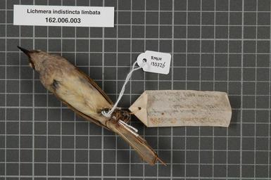 | Keywords: Naturalis Biodiversity Center - RMNH.AVES.133726 2 - Lichmera indistincta limbata (S. Muller, 1843) - Meliphagidae - bird skin specimen.jpeg artwork Dimensions artwork Document type Meliphagidae Lichmera Individual count 1 Infraspecific epithet limbata Infraspecific rank Institution Naturalis Kind of unit artwork Kind of unit specimen skin Life stage Soemba Medium artwork Nomenclatural code Additional info remark Bütt N L M 1882 1882 crossed out 1892 Occurrence ID page Other fields Other versions artwork Permission license Naturalis donation CC-0 Publication location Scientific name Lichmera indistincta limbata S Muller 1843 Scientific name authorship S Müller 1843 Source url http //bioportal naturalis nl Specific epithet indistincta State or province Soemba Subject keywords artwork Subject keywords publication Title artwork Title publication Type status Uploaded with GWToolset Naturalis_Biodiversity_Center_-_RMNH AVES 133726_2_-_Lichmera_indistincta_limbata_ S _Muller _1843 _-_Meliphagidae_-_bird_skin_specimen http //medialib naturalis nl/file/id/RMNH AVES 133726_2/format/large Media donated by Naturalis Biodiversity Center Songbird specimens at Naturalis Biodiversity Center Lichmera indistincta Lichmera |
