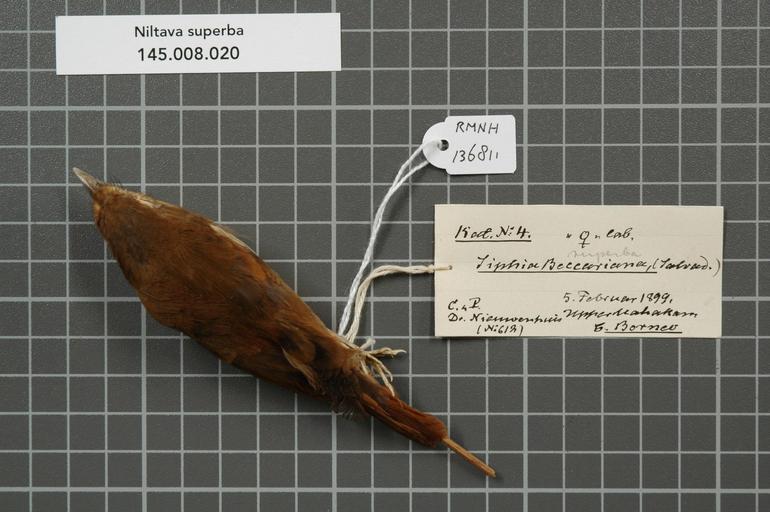 | Keywords: Naturalis Biodiversity Center - RMNH.AVES.136811 1 - Niltava superba (Stresemann, 1925) - Muscicapidae - bird skin specimen.jpeg artwork Dimensions artwork Document type Muscicapidae Niltava Individual count 1 Infraspecific epithet Infraspecific rank Institution Naturalis Kind of unit artwork Kind of unit specimen skin Life stage Indonesia C Borneo Upper Mahakam Medium artwork Nomenclatural code Sex remark on label female lab Occurrence ID page Other fields Other versions artwork Permission license Naturalis donation CC-0 Publication location Scientific name Niltava superba Stresemann 1925 Scientific name authorship Stresemann 1925 female Source url http //bioportal naturalis nl Specific epithet superba State or province C Borneo Upper Mahakam Subject keywords artwork Subject keywords publication Title artwork Title publication Type status Uploaded with GWToolset Naturalis_Biodiversity_Center_-_RMNH AVES 136811_1_-_Niltava_superba_ Stresemann _1925 _-_Muscicapidae_-_bird_skin_specimen http //medialib naturalis nl/file/id/RMNH AVES 136811_1/format/large Media donated by Naturalis Biodiversity Center Songbird specimens at Naturalis Biodiversity Center Cyornis superbus museum specimens |