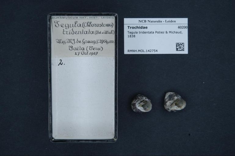 Keywords: Naturalis Biodiversity Center - RMNH.MOL.142754 - Tegula tridentata (Potiez & Michaud, 1838) - Turbinidae - Mollusc shell.jpeg artwork Dimensions artwork Document type Turbinidae Tegula Individual count Infraspecific epithet Infraspecific rank Institution Naturalis Kind of unit artwork Kind of unit specimen shell Life stage Medium artwork Nomenclatural code Source institute Leiden Scale the width of the text on the species/QR-code label is 38 mm Occurrence ID page Other fields Other versions artwork Permission license Naturalis donation CC-0 Mollusca Publication location Scientific name Tegula tridentata Potiez Michaud 1838 Scientific name authorship Potiez Michaud 1838 Source url http //bioportal naturalis nl Specific epithet tridentata State or province Subject keywords artwork Subject keywords publication Title artwork Title publication Type status Uploaded with GWToolset Naturalis_Biodiversity_Center_-_RMNH MOL 142754_-_Tegula_tridentata_ Potiez_ _Michaud _1838 _-_Turbinidae_-_Mollusc_shell http //medialib naturalis nl/file/id/RMNH MOL 142754/format/large Molluscs at Naturalis from the Rijksmuseum van Natuurlijke Historie Media donated by Naturalis Biodiversity Center Tegula Tegula tridentata |