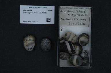 | Keywords: Naturalis Biodiversity Center - RMNH.MOL.150157 - Vitta virginea (Linnaeus, 1758) - Neritidae - Mollusc shell.jpeg artwork Dimensions artwork Document type Neritidae Vitta Individual count Infraspecific epithet Infraspecific rank Institution Naturalis Kind of unit artwork Kind of unit specimen shell Life stage Medium artwork Nomenclatural code Scale the width of the text on the species/QR-code label is 38 mm Occurrence ID page Other fields Other versions artwork Permission license Naturalis donation CC-0 Mollusca Publication location Scientific name Vitta virginea Linnaeus 1758 Scientific name authorship Linnaeus 1758 Source url http //bioportal naturalis nl Specific epithet virginea State or province Subject keywords artwork Subject keywords publication Title artwork Title publication Type status Uploaded with GWToolset Naturalis_Biodiversity_Center_-_RMNH MOL 150157_-_Vitta_virginea_ Linnaeus _1758 _-_Neritidae_-_Mollusc_shell http //medialib naturalis nl/file/id/RMNH MOL 150157/format/large Media donated by Naturalis Biodiversity Center Molluscs at Naturalis from the Rijksmuseum van Natuurlijke Historie Vitta virginea |