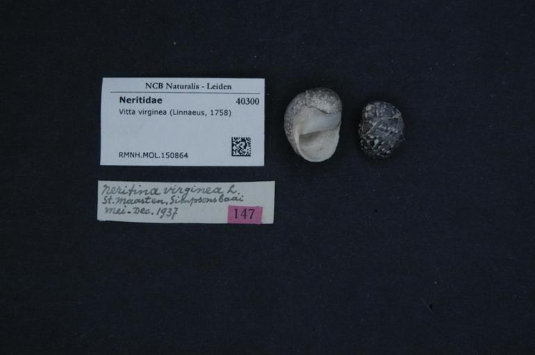 | Keywords: Naturalis Biodiversity Center - RMNH.MOL.150864 - Vitta virginea (Linnaeus, 1758) - Neritidae - Mollusc shell.jpeg artwork Dimensions artwork Document type Neritidae Vitta Individual count Infraspecific epithet Infraspecific rank Institution Naturalis Kind of unit artwork Kind of unit specimen shell Life stage Medium artwork Nomenclatural code Scale the width of the text on the species/QR-code label is 38 mm Occurrence ID page Other fields Other versions artwork Permission license Naturalis donation CC-0 Mollusca Publication location Scientific name Vitta virginea Linnaeus 1758 Scientific name authorship Linnaeus 1758 Source url http //bioportal naturalis nl Specific epithet virginea State or province Subject keywords artwork Subject keywords publication Title artwork Title publication Type status Uploaded with GWToolset Naturalis_Biodiversity_Center_-_RMNH MOL 150864_-_Vitta_virginea_ Linnaeus _1758 _-_Neritidae_-_Mollusc_shell http //medialib naturalis nl/file/id/RMNH MOL 150864/format/large Media donated by Naturalis Biodiversity Center Molluscs at Naturalis from the Rijksmuseum van Natuurlijke Historie Vitta virginea Vitta |