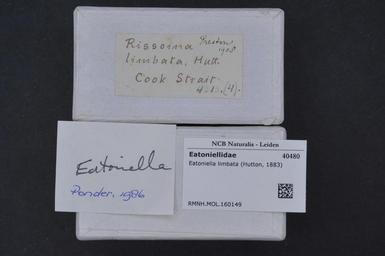 | Keywords: Naturalis Biodiversity Center - RMNH.MOL.160149 2 - Eatoniella limbata (Hutton, 1883) - Eatoniellidae - Mollusc shell.jpeg artwork Dimensions artwork Document type Eatoniellidae Eatoniella Individual count Infraspecific epithet Infraspecific rank Institution Naturalis Kind of unit artwork Kind of unit specimen shell Life stage Medium artwork Nomenclatural code Scale the width of the text on the species/QR-code label is 38 mm Occurrence ID page Other fields Other versions artwork Permission license Naturalis donation CC-0 Mollusca Publication location Scientific name Eatoniella limbata Hutton 1883 Scientific name authorship Hutton 1883 Source url http //bioportal naturalis nl Specific epithet limbata State or province Subject keywords artwork Subject keywords publication Title artwork Title publication Type status Uploaded with GWToolset Naturalis_Biodiversity_Center_-_RMNH MOL 160149_2_-_Eatoniella_limbata_ Hutton _1883 _-_Eatoniellidae_-_Mollusc_shell http //medialib naturalis nl/file/id/RMNH MOL 160149_2/format/large Media donated by Naturalis Biodiversity Center Molluscs at Naturalis from the Rijksmuseum van Natuurlijke Historie Eatoniella limbata Eatoniella |