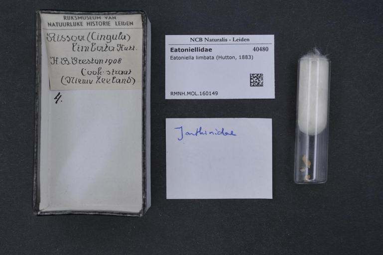 | Keywords: Naturalis Biodiversity Center - RMNH.MOL.160149 1 - Eatoniella limbata (Hutton, 1883) - Eatoniellidae - Mollusc shell.jpeg  artwork Dimensions artwork Document type Eatoniellidae Eatoniella Individual count Infraspecific epithet Infraspecific rank Institution Naturalis Kind of unit artwork Kind of unit specimen shell Life stage Medium artwork Nomenclatural code Scale the width of the text on the species/QR-code label is 38 mm Occurrence ID page Other fields Other versions artwork Permission license Naturalis donation CC-0 Mollusca Publication location Scientific name Eatoniella limbata Hutton 1883 Scientific name authorship Hutton 1883 Source url http //bioportal naturalis nl Specific epithet limbata State or province Subject keywords artwork Subject keywords publication Title artwork Title publication Type status Uploaded with GWToolset Naturalis_Biodiversity_Center_-_RMNH MOL 160149_1_-_Eatoniella_limbata_ Hutton _1883 _-_Eatoniellidae_-_Mollusc_shell http //medialib naturalis nl/file/id/RMNH MOL 160149_1/format/large Media donated by Naturalis Biodiversity Center Molluscs at Naturalis from the Rijksmuseum van Natuurlijke Historie Eatoniella limbata Eatoniella |