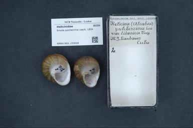 | Keywords: Naturalis Biodiversity Center - RMNH.MOL.153028 - Emoda pulcherrima Leach, 1834 - Helicinidae - Mollusc shell.jpeg artwork Dimensions artwork Document type Helicinidae Emoda Individual count Infraspecific epithet Infraspecific rank Institution Naturalis Kind of unit artwork Kind of unit specimen shell Life stage Medium artwork Nomenclatural code Scale the width of the text on the species/QR-code label is 38 mm Occurrence ID page Other fields Other versions artwork Permission license Naturalis donation CC-0 Mollusca Publication location Scientific name Emoda pulcherrima Leach 1834 Scientific name authorship Leach 1834 Source url http //bioportal naturalis nl Specific epithet pulcherrima State or province Subject keywords artwork Subject keywords publication Title artwork Title publication Type status Uploaded with GWToolset Naturalis_Biodiversity_Center_-_RMNH MOL 153028_-_Emoda_pulcherrima_Leach _1834_-_Helicinidae_-_Mollusc_shell http //medialib naturalis nl/file/id/RMNH MOL 153028/format/large Media donated by Naturalis Biodiversity Center Molluscs at Naturalis from the Rijksmuseum van Natuurlijke Historie Emoda pulcherrima Emoda |