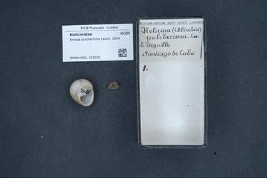 | Keywords: Naturalis Biodiversity Center - RMNH.MOL.153029 - Emoda pulcherrima Leach, 1834 - Helicinidae - Mollusc shell.jpeg artwork Dimensions artwork Document type Helicinidae Emoda Individual count Infraspecific epithet Infraspecific rank Institution Naturalis Kind of unit artwork Kind of unit specimen shell Life stage Medium artwork Nomenclatural code Scale the width of the text on the species/QR-code label is 38 mm Occurrence ID page Other fields Other versions artwork Permission license Naturalis donation CC-0 Mollusca Publication location Scientific name Emoda pulcherrima Leach 1834 Scientific name authorship Leach 1834 Source url http //bioportal naturalis nl Specific epithet pulcherrima State or province Subject keywords artwork Subject keywords publication Title artwork Title publication Type status Uploaded with GWToolset Naturalis_Biodiversity_Center_-_RMNH MOL 153029_-_Emoda_pulcherrima_Leach _1834_-_Helicinidae_-_Mollusc_shell http //medialib naturalis nl/file/id/RMNH MOL 153029/format/large Media donated by Naturalis Biodiversity Center Molluscs at Naturalis from the Rijksmuseum van Natuurlijke Historie Emoda pulcherrima Emoda |