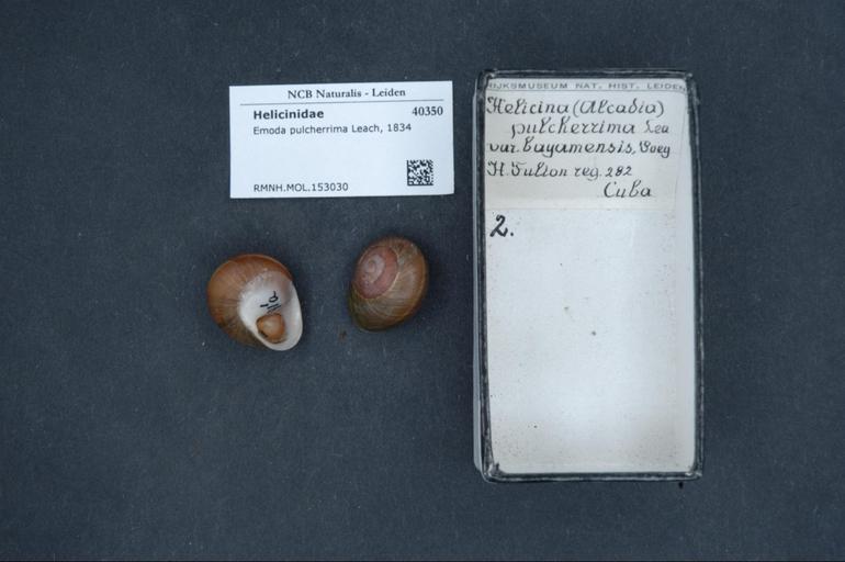 | Keywords: Naturalis Biodiversity Center - RMNH.MOL.153030 - Emoda pulcherrima Leach, 1834 - Helicinidae - Mollusc shell.jpeg artwork Dimensions artwork Document type Helicinidae Emoda Individual count Infraspecific epithet Infraspecific rank Institution Naturalis Kind of unit artwork Kind of unit specimen shell Life stage Medium artwork Nomenclatural code Scale the width of the text on the species/QR-code label is 38 mm Occurrence ID page Other fields Other versions artwork Permission license Naturalis donation CC-0 Mollusca Publication location Scientific name Emoda pulcherrima Leach 1834 Scientific name authorship Leach 1834 Source url http //bioportal naturalis nl Specific epithet pulcherrima State or province Subject keywords artwork Subject keywords publication Title artwork Title publication Type status Uploaded with GWToolset Naturalis_Biodiversity_Center_-_RMNH MOL 153030_-_Emoda_pulcherrima_Leach _1834_-_Helicinidae_-_Mollusc_shell http //medialib naturalis nl/file/id/RMNH MOL 153030/format/large Media donated by Naturalis Biodiversity Center Molluscs at Naturalis from the Rijksmuseum van Natuurlijke Historie Emoda pulcherrima Emoda |