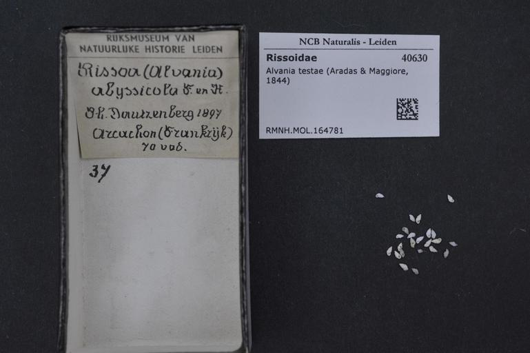 | Keywords: Naturalis Biodiversity Center - RMNH.MOL.164781 - Alvania testae (Aradas & Maggiore, 1844) - Rissoidae - Mollusc shell.jpeg  artwork Dimensions artwork Document type Rissoidae subfamily Rissoinae Alvania Individual count Infraspecific epithet Infraspecific rank Institution Naturalis Kind of unit artwork Kind of unit specimen shell Life stage Medium artwork Nomenclatural code Scale the width of the text on the species/QR-code label is 38 mm Occurrence ID page Other fields Other versions artwork Permission license Naturalis donation CC-0 Mollusca Publication location Scientific name Alvania testae Aradas Maggiore 1844 Scientific name authorship Aradas Maggiore 1844 Source url http //bioportal naturalis nl Specific epithet testae State or province Subject keywords artwork Subject keywords publication Title artwork Title publication Type status Uploaded with GWToolset Naturalis_Biodiversity_Center_-_RMNH MOL 164781_-_Alvania_testae_ Aradas_ _Maggiore _1844 _-_Rissoidae_-_Mollusc_shell http //medialib naturalis nl/file/id/RMNH MOL 164781/format/large Media donated by Naturalis Biodiversity Center Molluscs at Naturalis from the Rijksmuseum van Natuurlijke Historie Alvania testae |