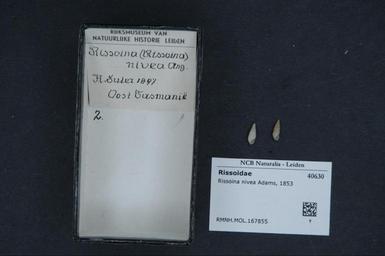 | Keywords: Naturalis Biodiversity Center - RMNH.MOL.167855 - Rissoina nivea Adams, 1853 - Rissoidae - Mollusc shell.jpeg artwork Dimensions artwork Document type Rissoidae subfamily Rissoininae laevigata Individual count Infraspecific epithet Infraspecific rank Institution Naturalis Kind of unit artwork Kind of unit specimen shell Life stage Medium artwork Nomenclatural code Scale the width of the text on the species/QR-code label is 38 mm Occurrence ID page Other fields Other versions artwork Permission license Naturalis donation CC-0 Mollusca Publication location Scientific name Rissoina nivea Adams 1853 Scientific name authorship Adams 1853 Source url http //bioportal naturalis nl Specific epithet nivea State or province Subject keywords artwork Subject keywords publication Title artwork Title publication Type status Uploaded with GWToolset Naturalis_Biodiversity_Center_-_RMNH MOL 167855_-_Rissoina_nivea_Adams _1853_-_Rissoidae_-_Mollusc_shell http //medialib naturalis nl/file/id/RMNH MOL 167855/format/large Media donated by Naturalis Biodiversity Center Molluscs at Naturalis from the Rijksmuseum van Natuurlijke Historie Rissoina nivea |
