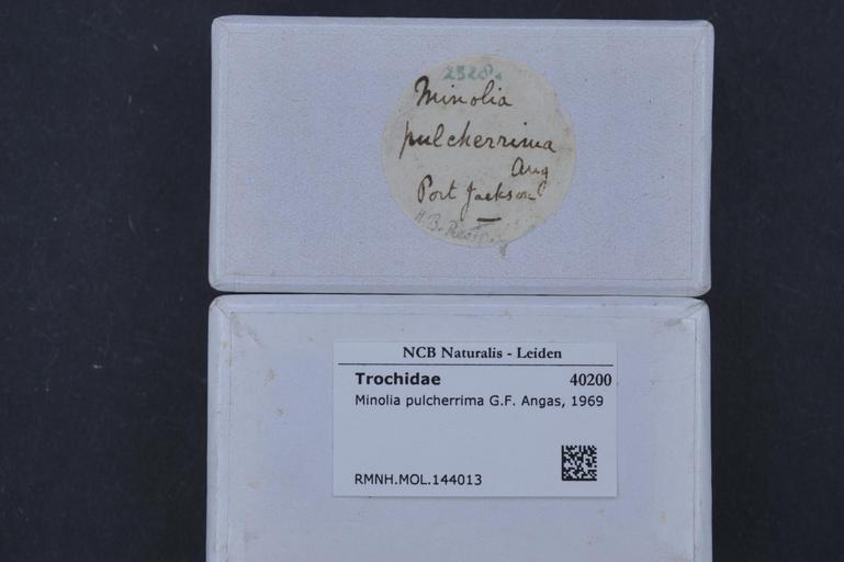 | Keywords: Naturalis Biodiversity Center - RMNH.MOL.144013 1 - Minolia pulcherrima G.F. Angas, 1969 - Solariellidae - Mollusc shell.jpeg artwork Dimensions artwork Document type Solariellidae Minolia Individual count Infraspecific epithet Infraspecific rank Institution Naturalis Kind of unit artwork Kind of unit specimen shell Life stage Medium artwork Nomenclatural code Source institute Leiden Scale the width of the text on the species/QR-code label is 38 mm Occurrence ID page Other fields Other versions artwork Permission license Naturalis donation CC-0 Mollusca Publication location Scientific name Minolia pulcherrima G F Angas 1969 Scientific name authorship G F Angas 1969 Source url http //bioportal naturalis nl Specific epithet pulcherrima State or province Subject keywords artwork Subject keywords publication Title artwork Title publication Type status Uploaded with GWToolset Naturalis_Biodiversity_Center_-_RMNH MOL 144013_1_-_Minolia_pulcherrima_G F _Angas _1969_-_Solariellidae_-_Mollusc_shell http //medialib naturalis nl/file/id/RMNH MOL 144013_1/format/large Molluscs at Naturalis from the Rijksmuseum van Natuurlijke Historie Media donated by Naturalis Biodiversity Center Minolia Minolia pulcherrima |