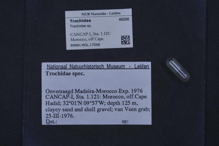 | Keywords: Naturalis Biodiversity Center - RMNH.MOL.17066 - Trochidae - Trochidae - Mollusc shell.jpeg artwork Dimensions artwork Document type Trochidae Unidentified Trochidae Goud J Individual count Infraspecific epithet Infraspecific rank Institution Naturalis Kind of unit artwork Kind of unit specimen shell Life stage CANCAP-I Sta 1 121 Morocco off Cape Hadid; 32°01'N 09°57'W; depth 125 m clayey sand and shell gravel; van Veen grab; 25 iii 1976 Medium artwork Nomenclatural code Source institute Leiden Source institute Rijksmuseum van Natuurlijke Historie Leiden Scale the width of the text on the species/QR-code label is 38 mm Occurrence ID page Other fields Other versions artwork Permission license Naturalis donation CC-0 Mollusca Publication location Scientific name Trochidae Scientific name authorship Source url http //bioportal naturalis nl Specific epithet State or province Subject keywords artwork Subject keywords publication Title artwork Title publication Type status Uploaded with GWToolset Naturalis_Biodiversity_Center_-_RMNH MOL 17066_-_Trochidae_-_Trochidae_-_Mollusc_shell http //medialib naturalis nl/file/id/RMNH MOL 17066/format/large Media donated by Naturalis Biodiversity Center Molluscs at Naturalis from the Rijksmuseum van Natuurlijke Historie Unidentified Trochidae Unidentified Trochidae |