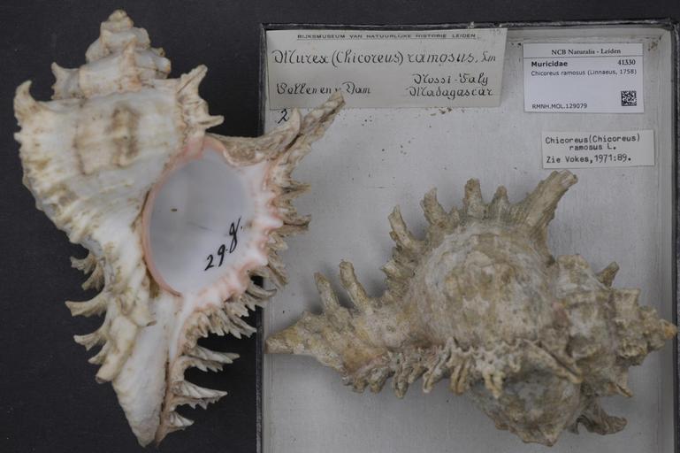 | Keywords: Naturalis Biodiversity Center - RMNH.MOL.129079 - Chicoreus ramosus (Linnaeus, 1758) - Muricidae - Mollusc shell.jpeg artwork Dimensions artwork Document type Muricidae subfamily Muricinae Chicoreus Individual count Infraspecific epithet Infraspecific rank Institution Naturalis Kind of unit artwork Kind of unit specimen shell Life stage Medium artwork Nomenclatural code Source institute Leiden Scale the width of the text on the species/QR-code label is 38 mm Occurrence ID page Neogastropoda Other fields Other versions artwork Permission license Naturalis donation CC-0 Mollusca Publication location Scientific name Chicoreus ramosus Linnaeus 1758 Scientific name authorship Linnaeus 1758 Source url http //bioportal naturalis nl Specific epithet ramosus State or province Subject keywords artwork Subject keywords publication Title artwork Title publication Type status Uploaded with GWToolset Naturalis_Biodiversity_Center_-_RMNH MOL 129079_-_Chicoreus_ramosus_ Linnaeus _1758 _-_Muricidae_-_Mollusc_shell http //medialib naturalis nl/file/id/RMNH MOL 129079/format/large Molluscs at Naturalis from the Rijksmuseum van Natuurlijke Historie Media donated by Naturalis Biodiversity Center Chicoreus ramosus |