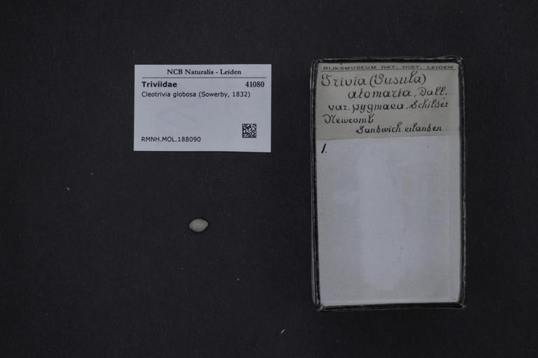 Keywords: Naturalis Biodiversity Center - RMNH.MOL.188090 - Cleotrivia globosa (Sowerby, 1832) - Triviidae - Mollusc shell.jpeg artwork Dimensions artwork Document type Triviidae Cleotrivia Individual count Infraspecific epithet Infraspecific rank Institution Naturalis Kind of unit artwork Kind of unit specimen shell Life stage Medium artwork Nomenclatural code Source institute Rijksmuseum van Natuurlijke Historie Leiden Scale the width of the text on the species/QR-code label is 38 mm Occurrence ID page Other fields Other versions artwork Permission license Naturalis donation CC-0 Mollusca Publication location Scientific name Cleotrivia globosa Sowerby 1832 Scientific name authorship Sowerby 1832 Source url http //bioportal naturalis nl Specific epithet globosa State or province Subject keywords artwork Subject keywords publication Title artwork Title publication Type status Uploaded with GWToolset Naturalis_Biodiversity_Center_-_RMNH MOL 188090_-_Cleotrivia_globosa_ Sowerby _1832 _-_Triviidae_-_Mollusc_shell http //medialib naturalis nl/file/id/RMNH MOL 188090/format/large Media donated by Naturalis Biodiversity Center Molluscs at Naturalis from the Rijksmuseum van Natuurlijke Historie Cleotrivia globosa Cleotrivia |