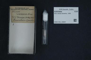 | Keywords: Naturalis Biodiversity Center - RMNH.MOL.196857 - Niso venosa Sowerby, 1895 - Eulimidae - Mollusc shell.jpeg artwork Dimensions artwork Document type Eulimidae Niso Individual count Infraspecific epithet Infraspecific rank Institution Naturalis Kind of unit artwork Kind of unit specimen shell Life stage Medium artwork Nomenclatural code Source institute Rijksmuseum van Natuurlijke Historie Leiden Scale the width of the text on the species/QR-code label is 38 mm Occurrence ID page Other fields Other versions artwork Permission license Naturalis donation CC-0 Mollusca Publication location Scientific name Niso venosa Sowerby 1895 Scientific name authorship Sowerby 1895 Source url http //bioportal naturalis nl Specific epithet venosa State or province Subject keywords artwork Subject keywords publication Title artwork Title publication Type status Uploaded with GWToolset Naturalis_Biodiversity_Center_-_RMNH MOL 196857_-_Niso_venosa_Sowerby _1895_-_Eulimidae_-_Mollusc_shell http //medialib naturalis nl/file/id/RMNH MOL 196857/format/large Media donated by Naturalis Biodiversity Center Molluscs at Naturalis from the Rijksmuseum van Natuurlijke Historie Niso venosa Niso |