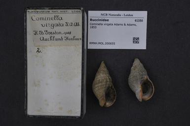 | Keywords: Naturalis Biodiversity Center - RMNH.MOL.200655 - Cominella virgata Adams & Adams, 1853 - Buccinidae - Mollusc shell.jpeg artwork Dimensions artwork Document type Buccinidae subfamily Photinae Cominella Individual count Infraspecific epithet Infraspecific rank Institution Naturalis Kind of unit artwork Kind of unit specimen shell Life stage Medium artwork Nomenclatural code Source institute Rijksmuseum van Natuurlijke Historie Leiden Scale the width of the text on the species/QR-code label is 38 mm Occurrence ID page Other fields Other versions artwork Permission license Naturalis donation CC-0 Mollusca Publication location Scientific name Cominella virgata Adams Adams 1853 Scientific name authorship Adams Adams 1853 Source url http //bioportal naturalis nl Specific epithet virgata State or province Subject keywords artwork Subject keywords publication Title artwork Title publication Type status Uploaded with GWToolset Naturalis_Biodiversity_Center_-_RMNH MOL 200655_-_Cominella_virgata_Adams_ _Adams _1853_-_Buccinidae_-_Mollusc_shell http //medialib naturalis nl/file/id/RMNH MOL 200655/format/large Media donated by Naturalis Biodiversity Center Molluscs at Naturalis from the Rijksmuseum van Natuurlijke Historie Cominella virgata Cominella |