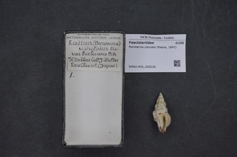 Keywords: Naturalis Biodiversity Center - RMNH.MOL.209226 - Peristernia ustulata (Reeve, 1847) - Fasciolariidae - Mollusc shell.jpeg artwork Dimensions artwork Document type Fasciolariidae subfamily Peristerniinae Peristernia Individual count Infraspecific epithet Infraspecific rank Institution Naturalis Kind of unit artwork Kind of unit specimen shell Life stage Medium artwork Nomenclatural code Source institute Rijksmuseum van Natuurlijke Historie Leiden Scale the width of the text on the species/QR-code label is 38 mm Occurrence ID page Other fields Other versions artwork Permission license Naturalis donation CC-0 Mollusca Publication location Scientific name Peristernia ustulata Reeve 1847 Scientific name authorship Reeve 1847 Source url http //bioportal naturalis nl Specific epithet ustulata State or province Subject keywords artwork Subject keywords publication Title artwork Title publication Type status Uploaded with GWToolset Naturalis_Biodiversity_Center_-_RMNH MOL 209226_-_Peristernia_ustulata_ Reeve _1847 _-_Fasciolariidae_-_Mollusc_shell http //medialib naturalis nl/file/id/RMNH MOL 209226/format/large Media donated by Naturalis Biodiversity Center Molluscs at Naturalis from the Rijksmuseum van Natuurlijke Historie Peristernia ustulata Peristernia |