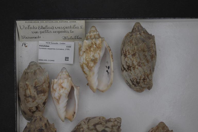 Keywords: Naturalis Biodiversity Center - RMNH.MOL.210440 - Cymbiola vespertilio Linnaeus, 1758 - Volutidae - Mollusc shell.jpeg artwork Dimensions artwork Document type Volutidae Cymbiola Individual count Infraspecific epithet Infraspecific rank Institution Naturalis Kind of unit artwork Kind of unit specimen shell Life stage Medium artwork Nomenclatural code Source institute Rijksmuseum van Natuurlijke Historie Leiden Scale the width of the text on the species/QR-code label is 38 mm Occurrence ID page Neogastropoda Other fields Other versions artwork Permission license Naturalis donation CC-0 Mollusca Publication location Scientific name Cymbiola vespertilio Linnaeus 1758 Scientific name authorship Linnaeus 1758 Source url http //bioportal naturalis nl Specific epithet vespertilio State or province Subject keywords artwork Subject keywords publication Title artwork Title publication Type status Uploaded with GWToolset Naturalis_Biodiversity_Center_-_RMNH MOL 210440_-_Cymbiola_vespertilio_Linnaeus _1758_-_Volutidae_-_Mollusc_shell http //medialib naturalis nl/file/id/RMNH MOL 210440/format/large Media donated by Naturalis Biodiversity Center Molluscs at Naturalis from the Rijksmuseum van Natuurlijke Historie Cymbiola vespertilio Cymbiola |