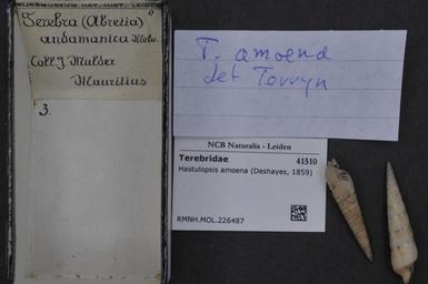 | Keywords: Naturalis Biodiversity Center - RMNH.MOL.226487 - Hastulopsis amoena (Deshayes, 1859) - Terebridae - Mollusc shell.jpeg artwork Dimensions artwork Document type Terebridae Hastulopsis Individual count Infraspecific epithet Infraspecific rank Institution Naturalis Kind of unit artwork Kind of unit specimen shell Life stage Medium artwork Nomenclatural code Source institute Rijksmuseum van Natuurlijke Historie Leiden Scale the width of the text on the species/QR-code label is 38 mm Occurrence ID page Other fields Other versions artwork Permission license Naturalis donation CC-0 Mollusca Publication location Scientific name Hastulopsis amoena Deshayes 1859 Scientific name authorship Deshayes 1859 Source url http //bioportal naturalis nl Specific epithet amoena State or province Subject keywords artwork Subject keywords publication Title artwork Title publication Type status Uploaded with GWToolset Naturalis_Biodiversity_Center_-_RMNH MOL 226487_-_Hastulopsis_amoena_ Deshayes _1859 _-_Terebridae_-_Mollusc_shell http //medialib naturalis nl/file/id/RMNH MOL 226487/format/large Molluscs at Naturalis from the Rijksmuseum van Natuurlijke Historie Media donated by Naturalis Biodiversity Center Hastulopsis amoena Hastulopsis |