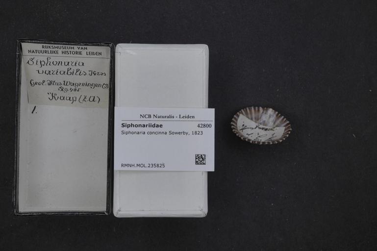 | Keywords: Naturalis Biodiversity Center - RMNH.MOL.235825 - Siphonaria concinna Sowerby, 1823 - Siphonariidae - Mollusc shell.jpeg artwork Dimensions artwork Document type Siphonariidae Siphonaria Individual count Infraspecific epithet Infraspecific rank Institution Naturalis Kind of unit artwork Kind of unit specimen shell Life stage Medium artwork Nomenclatural code Source institute Rijksmuseum van Natuurlijke Historie Leiden Scale the width of the text on the species/QR-code label is 38 mm Occurrence ID page Other fields Other versions artwork Permission license Naturalis donation CC-0 Mollusca Publication location Scientific name Siphonaria concinna Sowerby 1823 Scientific name authorship Sowerby 1823 Source url http //bioportal naturalis nl Specific epithet concinna State or province Subject keywords artwork Subject keywords publication Title artwork Title publication Type status Uploaded with GWToolset Naturalis_Biodiversity_Center_-_RMNH MOL 235825_-_Siphonaria_concinna_Sowerby _1823_-_Siphonariidae_-_Mollusc_shell http //medialib naturalis nl/file/id/RMNH MOL 235825/format/large Molluscs at Naturalis from the Rijksmuseum van Natuurlijke Historie Media donated by Naturalis Biodiversity Center Siphonaria concinna Siphonaria |