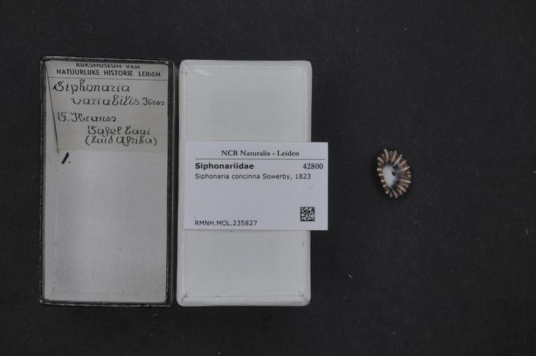 | Keywords: Naturalis Biodiversity Center - RMNH.MOL.235827 - Siphonaria concinna Sowerby, 1823 - Siphonariidae - Mollusc shell.jpeg artwork Dimensions artwork Document type Siphonariidae Siphonaria Individual count Infraspecific epithet Infraspecific rank Institution Naturalis Kind of unit artwork Kind of unit specimen shell Life stage Medium artwork Nomenclatural code Source institute Rijksmuseum van Natuurlijke Historie Leiden Scale the width of the text on the species/QR-code label is 38 mm Occurrence ID page Other fields Other versions artwork Permission license Naturalis donation CC-0 Mollusca Publication location Scientific name Siphonaria concinna Sowerby 1823 Scientific name authorship Sowerby 1823 Source url http //bioportal naturalis nl Specific epithet concinna State or province Subject keywords artwork Subject keywords publication Title artwork Title publication Type status Uploaded with GWToolset Naturalis_Biodiversity_Center_-_RMNH MOL 235827_-_Siphonaria_concinna_Sowerby _1823_-_Siphonariidae_-_Mollusc_shell http //medialib naturalis nl/file/id/RMNH MOL 235827/format/large Molluscs at Naturalis from the Rijksmuseum van Natuurlijke Historie Media donated by Naturalis Biodiversity Center Siphonaria concinna Siphonaria |