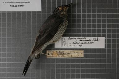 | Keywords: Naturalis Biodiversity Center - RMNH.AVES.123806 1 - Coracina fimbriata schierbrandii (Pelzeln, 1865) - Campephagidae - bird skin specimen.jpeg artwork Dimensions artwork Document type Campephagidae Coracina Individual count 1 Infraspecific epithet schierbrandii Infraspecific rank Institution Naturalis Kind of unit artwork Kind of unit specimen skin Life stage Indonesia Borneo Kapuas Smitau Medium artwork Nomenclatural code Occurrence ID page Other fields Other versions artwork Permission license Naturalis donation CC-0 Publication location Scientific name Coracina fimbriata schierbrandii Pelzeln 1865 Scientific name authorship Pelzeln 1865 female Source url http //bioportal naturalis nl Specific epithet fimbriata State or province Borneo Kapuas Subject keywords artwork Subject keywords publication Title artwork Title publication Type status Uploaded with GWToolset Naturalis_Biodiversity_Center_-_RMNH AVES 123806_1_-_Coracina_fimbriata_schierbrandii_ Pelzeln _1865 _-_Campephagidae_-_bird_skin_specimen http //medialib naturalis nl/file/id/RMNH AVES 123806_1/format/large Media donated by Naturalis Biodiversity Center Songbird specimens at Naturalis Biodiversity Center Coracina fimbriata schierbrandii |