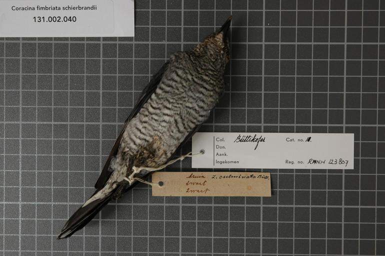 | Keywords: Naturalis Biodiversity Center - RMNH.AVES.123807 2 - Coracina fimbriata schierbrandii (Pelzeln, 1865) - Campephagidae - bird skin specimen.jpeg artwork Dimensions artwork Document type Campephagidae Coracina Individual count 1 Infraspecific epithet schierbrandii Infraspecific rank Institution Naturalis Kind of unit artwork Kind of unit specimen skin Life stage Indonesia Borneo voet v d Gng Kenepai Medium artwork Nomenclatural code Occurrence ID page Other fields Other versions artwork Permission license Naturalis donation CC-0 Publication location Scientific name Coracina fimbriata schierbrandii Pelzeln 1865 Scientific name authorship Pelzeln 1865 female Source url http //bioportal naturalis nl Specific epithet fimbriata State or province Subject keywords artwork Subject keywords publication Title artwork Title publication Type status Uploaded with GWToolset Naturalis_Biodiversity_Center_-_RMNH AVES 123807_2_-_Coracina_fimbriata_schierbrandii_ Pelzeln _1865 _-_Campephagidae_-_bird_skin_specimen http //medialib naturalis nl/file/id/RMNH AVES 123807_2/format/large Media donated by Naturalis Biodiversity Center Songbird specimens at Naturalis Biodiversity Center Coracina fimbriata schierbrandii |