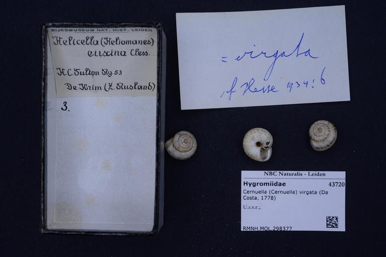 | Keywords: Naturalis Biodiversity Center - RMNH.MOL.298377 - Cernuella (Cernuella) virgata (Da Costa, 1778) - Hygromiidae - Mollusc shell.jpeg artwork Dimensions artwork Document type Hygromiidae subfamily Hygromiinae Cernuella Individual count Infraspecific epithet Infraspecific rank Institution Naturalis Kind of unit artwork Kind of unit specimen shell Life stage U s s r Medium artwork Nomenclatural code Source institute Rijksmuseum van Natuurlijke Historie Leiden Scale the width of the text on the species/QR-code label is 38 mm Occurrence ID page Other fields Other versions artwork Permission license Naturalis donation CC-0 Mollusca Publication location Scientific name Cernuella Cernuella virgata Da Costa 1778 Scientific name authorship Da Costa 1778 Source url http //bioportal naturalis nl Specific epithet virgata State or province Subject keywords artwork Subject keywords publication Title artwork Title publication Type status Uploaded with GWToolset Naturalis_Biodiversity_Center_-_RMNH MOL 298377_-_Cernuella_ Cernuella _virgata_ Da_Costa _1778 _-_Hygromiidae_-_Mollusc_shell http //medialib naturalis nl/file/id/RMNH MOL 298377/format/large Media donated by Naturalis Biodiversity Center Molluscs at Naturalis from the Rijksmuseum van Natuurlijke Historie Cernuella virgata Cernuella |