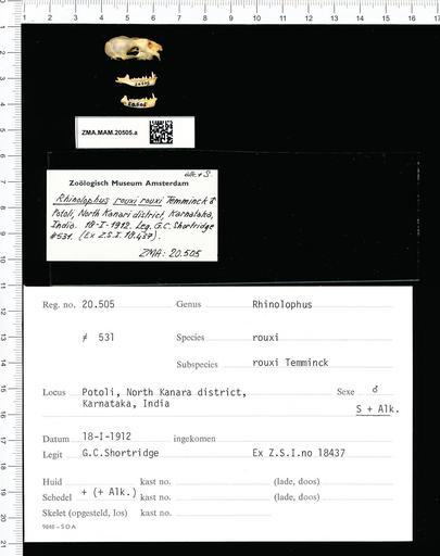 Keywords: Naturalis Biodiversity Center - ZMA.MAM.20505.a lat - Rhinolophus rouxii rouxii - skull.jpeg artwork Dimensions artwork Document type Rhinolophus Individual count 1 Infraspecific epithet rouxii Infraspecific rank Institution Naturalis Kind of unit artwork Kind of unit specimen skull Life stage Potoli North Kanari district Karnataka India Medium artwork Nomenclatural code Occurrence ID page Other fields Other versions artwork Permission license Naturalis donation CC-0 Publication location Scientific name Rhinolophus rouxii rouxii Scientific name authorship male Source url http //bioportal naturalis nl Specific epithet rouxii State or province Subject keywords artwork Subject keywords publication Title artwork Title publication Type status Uploaded with GWToolset Naturalis_Biodiversity_Center_-_ZMA MAM 20505 a_lat_-_Rhinolophus_rouxii_rouxii_-_skull http //medialib naturalis nl/file/id/ZMA MAM 20505 a_lat/format/large Mammals at Naturalis from the Zoölogisch Museum Amsterdam Media donated by Naturalis Biodiversity Center Rhinolophus rouxii Rhinolophus |