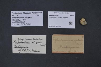 | Keywords: Naturalis Biodiversity Center - ZMA.MOLL.320520 - Tropidophora virgata (Sowerby, 1843) - Pomatiidae - Mollusc shell.jpeg artwork Dimensions artwork Document type Pomatiidae Tropidophora Individual count Infraspecific epithet Infraspecific rank Institution Naturalis Kind of unit artwork Kind of unit specimen shell Life stage Medium artwork Nomenclatural code Source institute Zoölogisch Museum Amsterdam Scale the width of the text on the species/QR-code label is 38 mm Occurrence ID page Other fields Other versions artwork Permission license Naturalis donation CC-0 Mollusca Publication location Scientific name Tropidophora virgata Sowerby 1843 Scientific name authorship Sowerby 1843 Source url http //bioportal naturalis nl Specific epithet virgata State or province Subject keywords artwork Subject keywords publication Title artwork Title publication Type status Uploaded with GWToolset Naturalis_Biodiversity_Center_-_ZMA MOLL 320520_-_Tropidophora_virgata_ Sowerby _1843 _-_Pomatiidae_-_Mollusc_shell http //medialib naturalis nl/file/id/ZMA MOLL 320520/format/large Media donated by Naturalis Biodiversity Center Molluscs at Naturalis from the Zoölogisch Museum Amsterdam Tropidophora virgata Tropidophora |