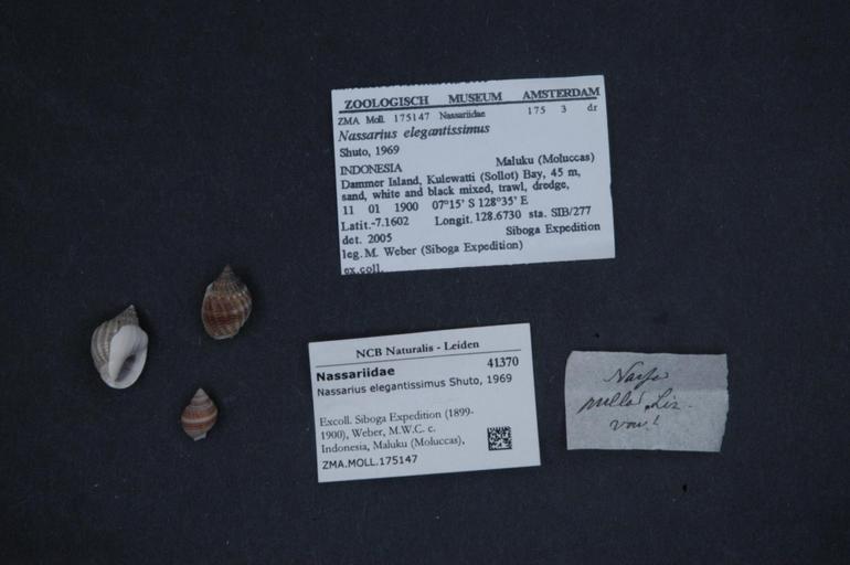 | Keywords: Naturalis Biodiversity Center - ZMA.MOLL.175147 - Nassarius elegantissimus Shuto, 1969 - Nassariidae - Mollusc shell.jpeg artwork Dimensions artwork Document type Nassariidae subfamily Nassariinae Nassarius Individual count Infraspecific epithet Infraspecific rank Institution Naturalis Kind of unit artwork Kind of unit specimen shell Life stage Indonesia Maluku Moluccas Dammer Island Kulewatti Sollot Bay 45 m sand white and black mixed trawl dredge reef-exploration; lat -7 1602 lon 128 673; 11-i-1900 stn sib/277 Medium artwork Nomenclatural code Collection remarks Moll Scale the width of the text on the species/QR-code label is 38 mm Occurrence ID page Other fields Other versions artwork Permission license Naturalis donation CC-0 Mollusca Publication location Scientific name Nassarius elegantissimus Shuto 1969 Scientific name authorship Shuto 1969 Source url http //bioportal naturalis nl Specific epithet elegantissimus State or province Maluku Moluccas Subject keywords artwork Subject keywords publication Title artwork Title publication Type status Uploaded with GWToolset Naturalis_Biodiversity_Center_-_ZMA MOLL 175147_-_Nassarius_elegantissimus_Shuto _1969_-_Nassariidae_-_Mollusc_shell http //medialib naturalis nl/file/id/ZMA MOLL 175147/format/large Media donated by Naturalis Biodiversity Center Molluscs at Naturalis from the Zoölogisch Museum Amsterdam Nassarius elegantissimus Nassarius |