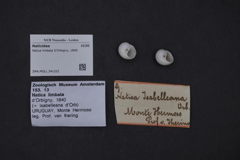 | Keywords: Naturalis Biodiversity Center - ZMA.MOLL.341221 - Natica limbata D'Orbigny, 1840 - Naticidae - Mollusc shell.jpeg  artwork Dimensions artwork Document type Naticidae subfamily Naticinae Natica Individual count Infraspecific epithet Infraspecific rank Institution Naturalis Kind of unit artwork Kind of unit specimen shell Life stage Medium artwork Nomenclatural code Source institute Zoölogisch Museum Amsterdam Scale the width of the text on the species/QR-code label is 38 mm Occurrence ID page Other fields Other versions artwork Permission license Naturalis donation CC-0 Mollusca Publication location Scientific name Natica limbata D'Orbigny 1840 Scientific name authorship D'Orbigny 1840 Source url http //bioportal naturalis nl Specific epithet limbata State or province Subject keywords artwork Subject keywords publication Title artwork Title publication Type status Uploaded with GWToolset Naturalis_Biodiversity_Center_-_ZMA MOLL 341221_-_Natica_limbata_D'Orbigny _1840_-_Naticidae_-_Mollusc_shell http //medialib naturalis nl/file/id/ZMA MOLL 341221/format/large Media donated by Naturalis Biodiversity Center Molluscs at Naturalis from the Zoölogisch Museum Amsterdam Natica limbata Natica |