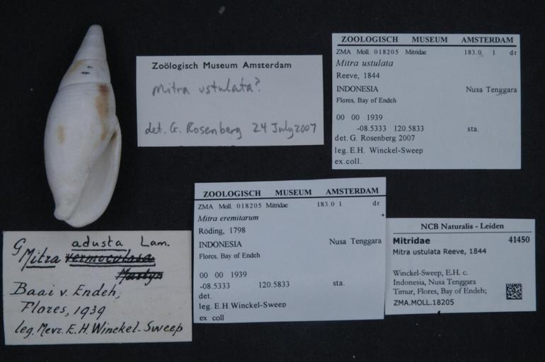 Keywords: Naturalis Biodiversity Center - ZMA.MOLL.18205 - Mitra ustulata Reeve, 1844 - Mitridae - Mollusc shell.jpeg artwork Dimensions artwork Document type Mitridae subfamily Mitrinae Mitra G Rosenberg Individual count Infraspecific epithet Infraspecific rank Institution Naturalis Kind of unit artwork Kind of unit specimen shell Life stage Indonesia Nusa Tenggara Timur Flores Bay of Endeh; lat -8 5333 lon 120 5833; 1939 Medium artwork Nomenclatural code Collection remarks Moll Scale the width of the text on the species/QR-code label is 38 mm Occurrence ID page Neogastropoda Other fields Other versions artwork Permission license Naturalis donation CC-0 Mollusca Publication location Scientific name Mitra ustulata Reeve 1844 Scientific name authorship Reeve 1844 Source url http //bioportal naturalis nl Specific epithet ustulata State or province Nusa Tenggara Timur Subject keywords artwork Subject keywords publication Title artwork Title publication Type status Uploaded with GWToolset Naturalis_Biodiversity_Center_-_ZMA MOLL 18205_-_Mitra_ustulata_Reeve _1844_-_Mitridae_-_Mollusc_shell http //medialib naturalis nl/file/id/ZMA MOLL 18205/format/large Media donated by Naturalis Biodiversity Center Molluscs at Naturalis from the Zoölogisch Museum Amsterdam Mitra ustulata |