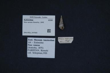 | Keywords: Naturalis Biodiversity Center - ZMA.MOLL.347660 - Niso venosa Sowerby, 1895 - Eulimidae - Mollusc shell.jpeg artwork Dimensions artwork Document type Eulimidae Niso Individual count Infraspecific epithet Infraspecific rank Institution Naturalis Kind of unit artwork Kind of unit specimen shell Life stage Medium artwork Nomenclatural code Source institute Zoölogisch Museum Amsterdam Scale the width of the text on the species/QR-code label is 38 mm Occurrence ID page Other fields Other versions artwork Permission license Naturalis donation CC-0 Mollusca Publication location Scientific name Niso venosa Sowerby 1895 Scientific name authorship Sowerby 1895 Source url http //bioportal naturalis nl Specific epithet venosa State or province Subject keywords artwork Subject keywords publication Title artwork Title publication Type status Uploaded with GWToolset Naturalis_Biodiversity_Center_-_ZMA MOLL 347660_-_Niso_venosa_Sowerby _1895_-_Eulimidae_-_Mollusc_shell http //medialib naturalis nl/file/id/ZMA MOLL 347660/format/large Media donated by Naturalis Biodiversity Center Molluscs at Naturalis from the Zoölogisch Museum Amsterdam Niso venosa Niso |