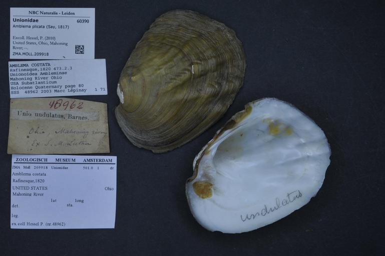 | Keywords: Naturalis Biodiversity Center - ZMA.MOLL.209918 - Amblema plicata (Say, 1817) - Unionidae - Mollusc shell.jpeg artwork Dimensions artwork Document type Unionidae Amblema Individual count Infraspecific epithet Infraspecific rank Institution Naturalis Kind of unit artwork Kind of unit specimen shell Life stage United States Ohio Mahoning River Medium artwork Nomenclatural code Scale the width of the text on the species/QR-code label is 38 mm Occurrence ID page Other fields Other versions artwork Permission license Naturalis donation CC-0 Mollusca Publication location Scientific name Amblema plicata Say 1817 Scientific name authorship Say 1817 Source url http //bioportal naturalis nl Specific epithet plicata State or province Ohio Subject keywords artwork Subject keywords publication Title artwork Title publication Type status Uploaded with GWToolset Naturalis_Biodiversity_Center_-_ZMA MOLL 209918_-_Amblema_plicata_ Say _1817 _-_Unionidae_-_Mollusc_shell http //medialib naturalis nl/file/id/ZMA MOLL 209918/format/large Media donated by Naturalis Biodiversity Center Molluscs at Naturalis from the Zoölogisch Museum Amsterdam Amblema plicata |