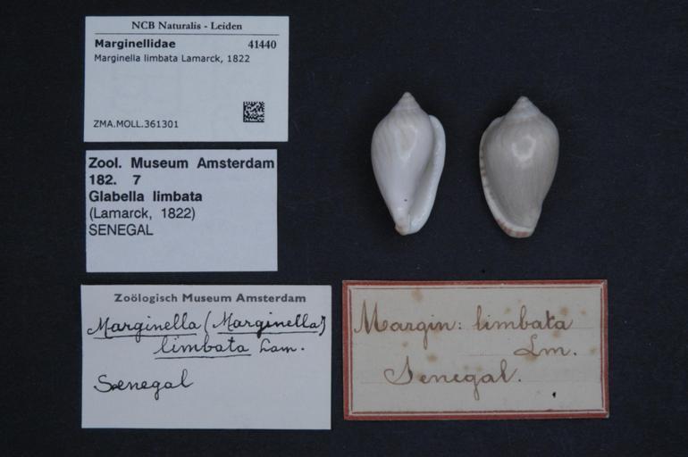| Keywords: Naturalis Biodiversity Center - ZMA.MOLL.361301 - Marginella limbata Lamarck, 1822 - Marginellidae - Mollusc shell.jpeg  artwork Dimensions artwork Document type Marginellidae Marginella Individual count Infraspecific epithet Infraspecific rank Institution Naturalis Kind of unit artwork Kind of unit specimen shell Life stage Medium artwork Nomenclatural code Source institute Zoölogisch Museum Amsterdam Scale the width of the text on the species/QR-code label is 38 mm Occurrence ID page Neogastropoda Other fields Other versions artwork Permission license Naturalis donation CC-0 Mollusca Publication location Scientific name Marginella limbata Lamarck 1822 Scientific name authorship Lamarck 1822 Source url http //bioportal naturalis nl Specific epithet limbata State or province Subject keywords artwork Subject keywords publication Title artwork Title publication Type status Uploaded with GWToolset Naturalis_Biodiversity_Center_-_ZMA MOLL 361301_-_Marginella_limbata_Lamarck _1822_-_Marginellidae_-_Mollusc_shell http //medialib naturalis nl/file/id/ZMA MOLL 361301/format/large Media donated by Naturalis Biodiversity Center Molluscs at Naturalis from the Zoölogisch Museum Amsterdam Marginella limbata Marginella |