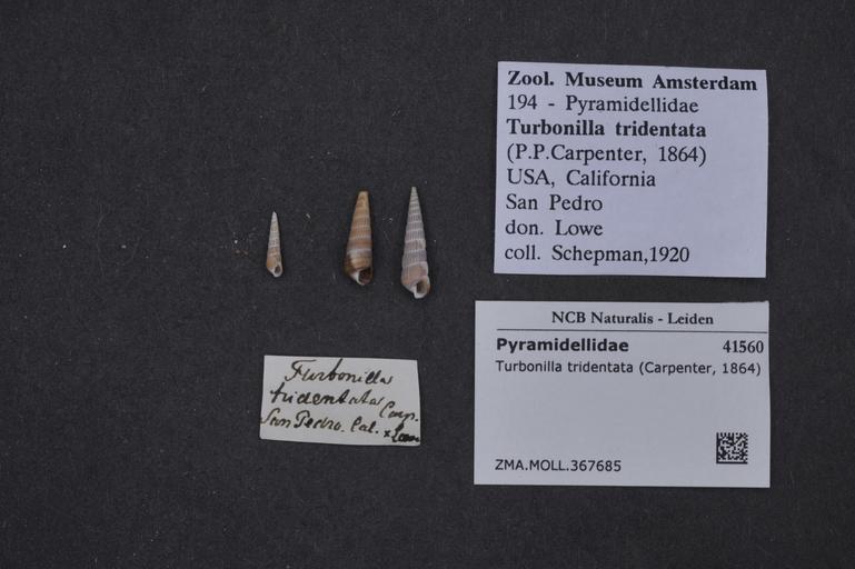 Keywords: Naturalis Biodiversity Center - ZMA.MOLL.367685 - Turbonilla tridentata (Carpenter, 1864) - Pyramidellidae - Mollusc shell.jpeg artwork Dimensions artwork Document type Pyramidellidae subfamily Turbonillinae Turbonilla Individual count Infraspecific epithet Infraspecific rank Institution Naturalis Kind of unit artwork Kind of unit specimen shell Life stage Medium artwork Nomenclatural code Source institute Zoölogisch Museum Amsterdam Scale the width of the text on the species/QR-code label is 38 mm Occurrence ID page Other fields Other versions artwork Permission license Naturalis donation CC-0 Mollusca Publication location Scientific name Turbonilla tridentata Carpenter 1864 Scientific name authorship Carpenter 1864 Source url http //bioportal naturalis nl Specific epithet tridentata State or province Subject keywords artwork Subject keywords publication Title artwork Title publication Type status Uploaded with GWToolset Naturalis_Biodiversity_Center_-_ZMA MOLL 367685_-_Turbonilla_tridentata_ Carpenter _1864 _-_Pyramidellidae_-_Mollusc_shell http //medialib naturalis nl/file/id/ZMA MOLL 367685/format/large Media donated by Naturalis Biodiversity Center Molluscs at Naturalis from the Zoölogisch Museum Amsterdam Turbonilla tridentata Turbonilla |