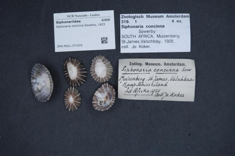 | Keywords: Naturalis Biodiversity Center - ZMA.MOLL.371022 - Siphonaria concinna Sowerby, 1823 - Siphonariidae - Mollusc shell.jpeg artwork Dimensions artwork Document type Siphonariidae Siphonaria Individual count Infraspecific epithet Infraspecific rank Institution Naturalis Kind of unit artwork Kind of unit specimen shell Life stage Medium artwork Nomenclatural code Source institute Zoölogisch Museum Amsterdam Scale the width of the text on the species/QR-code label is 38 mm Occurrence ID page Other fields Other versions artwork Permission license Naturalis donation CC-0 Mollusca Publication location Scientific name Siphonaria concinna Sowerby 1823 Scientific name authorship Sowerby 1823 Source url http //bioportal naturalis nl Specific epithet concinna State or province Subject keywords artwork Subject keywords publication Title artwork Title publication Type status Uploaded with GWToolset Naturalis_Biodiversity_Center_-_ZMA MOLL 371022_-_Siphonaria_concinna_Sowerby _1823_-_Siphonariidae_-_Mollusc_shell http //medialib naturalis nl/file/id/ZMA MOLL 371022/format/large Media donated by Naturalis Biodiversity Center Molluscs at Naturalis from the Zoölogisch Museum Amsterdam Siphonaria concinna Siphonaria |