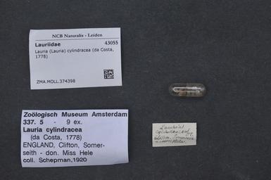 | Keywords: Naturalis Biodiversity Center - ZMA.MOLL.374398 - Lauria (Lauria) cylindracea (Da Costa, 1778) - Lauriidae - Mollusc shell.jpeg artwork Dimensions artwork Document type Lauriidae Lauria Individual count Infraspecific epithet Infraspecific rank Institution Naturalis Kind of unit artwork Kind of unit specimen shell Life stage Medium artwork Nomenclatural code Source institute Rijksmuseum van Natuurlijke Historie Leiden Scale the width of the text on the species/QR-code label is 38 mm Occurrence ID page Other fields Other versions artwork Permission license Naturalis donation CC-0 Mollusca Publication location Scientific name Lauria Lauria cylindracea Da Costa 1778 Scientific name authorship Da Costa 1778 Source url http //bioportal naturalis nl Specific epithet cylindracea State or province Subject keywords artwork Subject keywords publication Title artwork Title publication Type status Uploaded with GWToolset Naturalis_Biodiversity_Center_-_ZMA MOLL 374398_-_Lauria_ Lauria _cylindracea_ Da_Costa _1778 _-_Lauriidae_-_Mollusc_shell http //medialib naturalis nl/file/id/ZMA MOLL 374398/format/large Molluscs at Naturalis from the Zoölogisch Museum Amsterdam Media donated by Naturalis Biodiversity Center Lauria cylindracea Lauria |