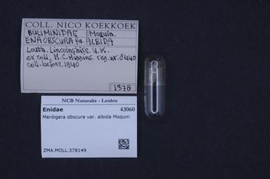 | Keywords: Naturalis Biodiversity Center - ZMA.MOLL.378149 - Merdigera obscura var. albida Moquin - Enidae - Mollusc shell.jpeg artwork Dimensions artwork Document type Enidae subfamily Bulimininae Merdigera Individual count Infraspecific epithet var Albida Infraspecific rank Institution Naturalis Kind of unit artwork Kind of unit specimen shell Life stage Medium artwork Nomenclatural code Source institute Rijksmuseum van Natuurlijke Historie Leiden Scale the width of the text on the species/QR-code label is 38 mm Occurrence ID page Other fields Other versions artwork Permission license Naturalis donation CC-0 Mollusca Publication location Scientific name Merdigera obscura var albida Moquin Scientific name authorship Müller 1774 Source url http //bioportal naturalis nl Specific epithet obscura State or province Subject keywords artwork Subject keywords publication Title artwork Title publication Type status Uploaded with GWToolset Naturalis_Biodiversity_Center_-_ZMA MOLL 378149_-_Merdigera_obscura_var _albida_Moquin_-_Enidae_-_Mollusc_shell http //medialib naturalis nl/file/id/ZMA MOLL 378149/format/large Molluscs at Naturalis from the Zoölogisch Museum Amsterdam Media donated by Naturalis Biodiversity Center Merdigera obscura Merdigera |