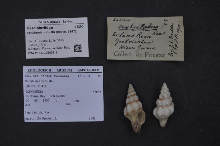 Keywords: Naturalis Biodiversity Center - ZMA.MOLL.225438.1 - Peristernia ustulata (Reeve, 1847) - Fasciolariidae - Mollusc shell.jpeg artwork Dimensions artwork Document type Fasciolariidae subfamily Peristerniinae Peristernia Individual count Infraspecific epithet Infraspecific rank Institution Naturalis Kind of unit artwork Kind of unit specimen shell Life stage Indonesia Papua Geelvink Bay Roon Island; 1935 Medium artwork Nomenclatural code Moll Scale the width of the text on the species/QR-code label is 38 mm Occurrence ID page Other fields Other versions artwork Permission license Naturalis donation CC-0 Mollusca Publication location Scientific name Peristernia ustulata Reeve 1847 Scientific name authorship Reeve 1847 Source url http //bioportal naturalis nl Specific epithet ustulata State or province Papua Subject keywords artwork Subject keywords publication Title artwork Title publication Type status Uploaded with GWToolset Naturalis_Biodiversity_Center_-_ZMA MOLL 225438 1_-_Peristernia_ustulata_ Reeve _1847 _-_Fasciolariidae_-_Mollusc_shell http //medialib naturalis nl/file/id/ZMA MOLL 225438 1/format/large Media donated by Naturalis Biodiversity Center Molluscs at Naturalis from the Zoölogisch Museum Amsterdam Peristernia ustulata Peristernia |