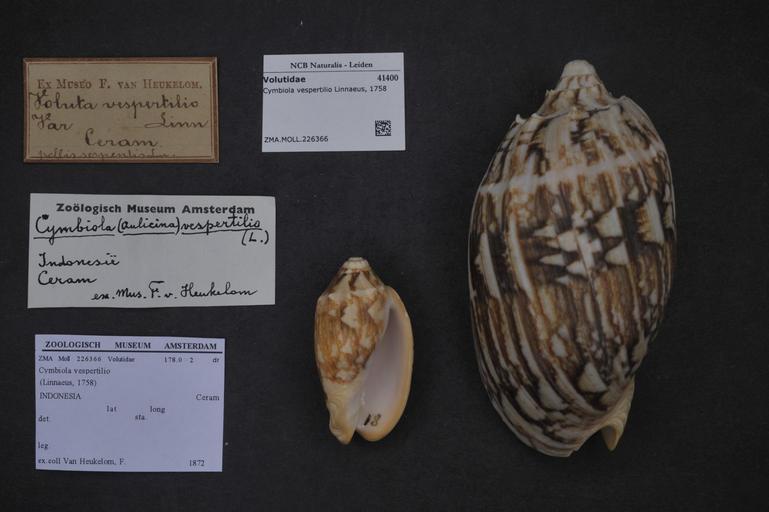 Keywords: Naturalis Biodiversity Center - ZMA.MOLL.226366 - Cymbiola vespertilio Linnaeus, 1758 - Volutidae - Mollusc shell.jpeg artwork Dimensions artwork Document type Volutidae Cymbiola Individual count Infraspecific epithet Infraspecific rank Institution Naturalis Kind of unit artwork Kind of unit specimen shell Life stage Medium artwork Nomenclatural code Scale the width of the text on the species/QR-code label is 38 mm Occurrence ID page Neogastropoda Other fields Other versions artwork Permission license Naturalis donation CC-0 Mollusca Publication location Scientific name Cymbiola vespertilio Linnaeus 1758 Scientific name authorship Linnaeus 1758 Source url http //bioportal naturalis nl Specific epithet vespertilio State or province Subject keywords artwork Subject keywords publication Title artwork Title publication Type status Uploaded with GWToolset Naturalis_Biodiversity_Center_-_ZMA MOLL 226366_-_Cymbiola_vespertilio_Linnaeus _1758_-_Volutidae_-_Mollusc_shell http //medialib naturalis nl/file/id/ZMA MOLL 226366/format/large Media donated by Naturalis Biodiversity Center Molluscs at Naturalis from the Zoölogisch Museum Amsterdam Cymbiola vespertilio Cymbiola |