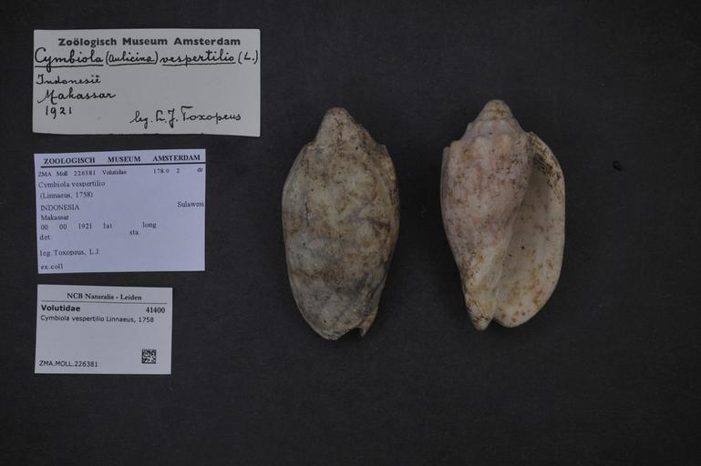 Keywords: Naturalis Biodiversity Center - ZMA.MOLL.226381 - Cymbiola vespertilio Linnaeus, 1758 - Volutidae - Mollusc shell.jpeg artwork Dimensions artwork Document type Volutidae Cymbiola Individual count Infraspecific epithet Infraspecific rank Institution Naturalis Kind of unit artwork Kind of unit specimen shell Life stage Medium artwork Nomenclatural code Scale the width of the text on the species/QR-code label is 38 mm Occurrence ID page Neogastropoda Other fields Other versions artwork Permission license Naturalis donation CC-0 Mollusca Publication location Scientific name Cymbiola vespertilio Linnaeus 1758 Scientific name authorship Linnaeus 1758 Source url http //bioportal naturalis nl Specific epithet vespertilio State or province Subject keywords artwork Subject keywords publication Title artwork Title publication Type status Uploaded with GWToolset Naturalis_Biodiversity_Center_-_ZMA MOLL 226381_-_Cymbiola_vespertilio_Linnaeus _1758_-_Volutidae_-_Mollusc_shell http //medialib naturalis nl/file/id/ZMA MOLL 226381/format/large Media donated by Naturalis Biodiversity Center Molluscs at Naturalis from the Zoölogisch Museum Amsterdam Cymbiola vespertilio Cymbiola |