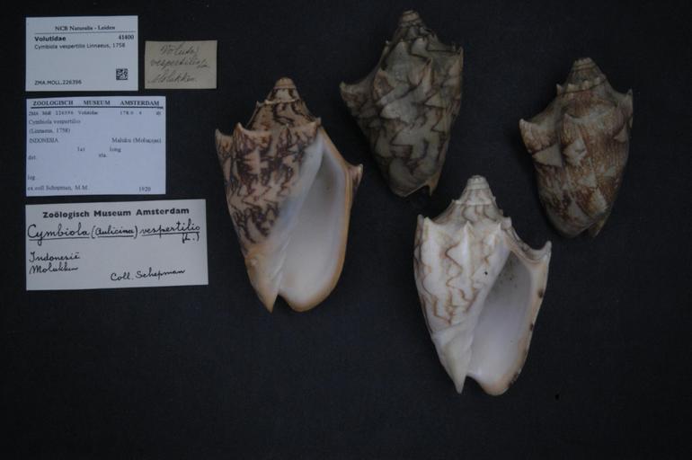 Keywords: Naturalis Biodiversity Center - ZMA.MOLL.226396 - Cymbiola vespertilio Linnaeus, 1758 - Volutidae - Mollusc shell.jpeg artwork Dimensions artwork Document type Volutidae Cymbiola Individual count Infraspecific epithet Infraspecific rank Institution Naturalis Kind of unit artwork Kind of unit specimen shell Life stage Medium artwork Nomenclatural code Scale the width of the text on the species/QR-code label is 38 mm Occurrence ID page Neogastropoda Other fields Other versions artwork Permission license Naturalis donation CC-0 Mollusca Publication location Scientific name Cymbiola vespertilio Linnaeus 1758 Scientific name authorship Linnaeus 1758 Source url http //bioportal naturalis nl Specific epithet vespertilio State or province Subject keywords artwork Subject keywords publication Title artwork Title publication Type status Uploaded with GWToolset Naturalis_Biodiversity_Center_-_ZMA MOLL 226396_-_Cymbiola_vespertilio_Linnaeus _1758_-_Volutidae_-_Mollusc_shell http //medialib naturalis nl/file/id/ZMA MOLL 226396/format/large Media donated by Naturalis Biodiversity Center Molluscs at Naturalis from the Zoölogisch Museum Amsterdam Cymbiola vespertilio Cymbiola |