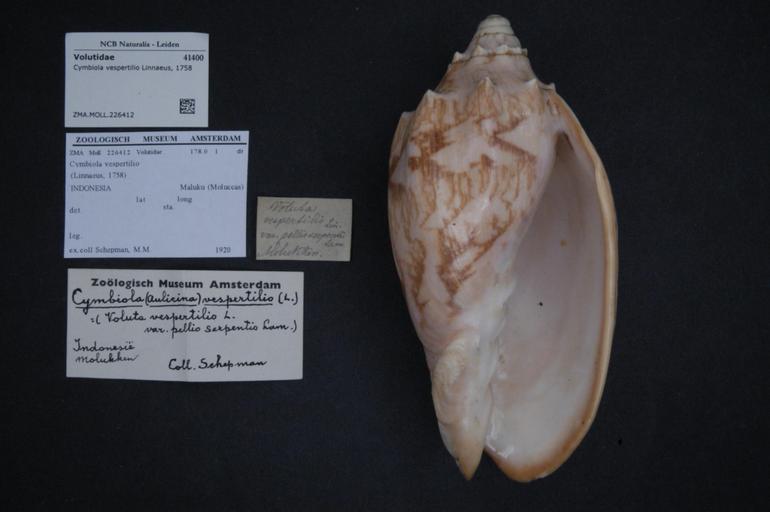 Keywords: Naturalis Biodiversity Center - ZMA.MOLL.226412 - Cymbiola vespertilio Linnaeus, 1758 - Volutidae - Mollusc shell.jpeg artwork Dimensions artwork Document type Volutidae Cymbiola Individual count Infraspecific epithet Infraspecific rank Institution Naturalis Kind of unit artwork Kind of unit specimen shell Life stage Medium artwork Nomenclatural code Scale the width of the text on the species/QR-code label is 38 mm Occurrence ID page Neogastropoda Other fields Other versions artwork Permission license Naturalis donation CC-0 Mollusca Publication location Scientific name Cymbiola vespertilio Linnaeus 1758 Scientific name authorship Linnaeus 1758 Source url http //bioportal naturalis nl Specific epithet vespertilio State or province Subject keywords artwork Subject keywords publication Title artwork Title publication Type status Uploaded with GWToolset Naturalis_Biodiversity_Center_-_ZMA MOLL 226412_-_Cymbiola_vespertilio_Linnaeus _1758_-_Volutidae_-_Mollusc_shell http //medialib naturalis nl/file/id/ZMA MOLL 226412/format/large Media donated by Naturalis Biodiversity Center Molluscs at Naturalis from the Zoölogisch Museum Amsterdam Cymbiola vespertilio Cymbiola |