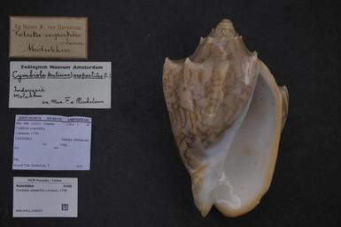 | Keywords: Naturalis Biodiversity Center - ZMA.MOLL.226423 - Cymbiola vespertilio Linnaeus, 1758 - Volutidae - Mollusc shell.jpeg artwork Dimensions artwork Document type Volutidae Cymbiola Individual count Infraspecific epithet Infraspecific rank Institution Naturalis Kind of unit artwork Kind of unit specimen shell Life stage Medium artwork Nomenclatural code Scale the width of the text on the species/QR-code label is 38 mm Occurrence ID page Neogastropoda Other fields Other versions artwork Permission license Naturalis donation CC-0 Mollusca Publication location Scientific name Cymbiola vespertilio Linnaeus 1758 Scientific name authorship Linnaeus 1758 Source url http //bioportal naturalis nl Specific epithet vespertilio State or province Subject keywords artwork Subject keywords publication Title artwork Title publication Type status Uploaded with GWToolset Naturalis_Biodiversity_Center_-_ZMA MOLL 226423_-_Cymbiola_vespertilio_Linnaeus _1758_-_Volutidae_-_Mollusc_shell http //medialib naturalis nl/file/id/ZMA MOLL 226423/format/large Media donated by Naturalis Biodiversity Center Molluscs at Naturalis from the Zoölogisch Museum Amsterdam Cymbiola vespertilio Cymbiola |