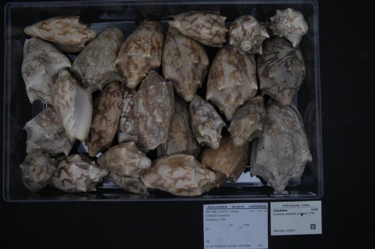 Keywords: Naturalis Biodiversity Center - ZMA.MOLL.226418 - Cymbiola vespertilio Linnaeus, 1758 - Volutidae - Mollusc shell.jpeg artwork Dimensions artwork Document type Volutidae Cymbiola Individual count Infraspecific epithet Infraspecific rank Institution Naturalis Kind of unit artwork Kind of unit specimen shell Life stage Medium artwork Nomenclatural code Scale the width of the text on the species/QR-code label is 38 mm Occurrence ID page Neogastropoda Other fields Other versions artwork Permission license Naturalis donation CC-0 Mollusca Publication location Scientific name Cymbiola vespertilio Linnaeus 1758 Scientific name authorship Linnaeus 1758 Source url http //bioportal naturalis nl Specific epithet vespertilio State or province Subject keywords artwork Subject keywords publication Title artwork Title publication Type status Uploaded with GWToolset Naturalis_Biodiversity_Center_-_ZMA MOLL 226418_-_Cymbiola_vespertilio_Linnaeus _1758_-_Volutidae_-_Mollusc_shell http //medialib naturalis nl/file/id/ZMA MOLL 226418/format/large Media donated by Naturalis Biodiversity Center Molluscs at Naturalis from the Zoölogisch Museum Amsterdam Cymbiola vespertilio Cymbiola |