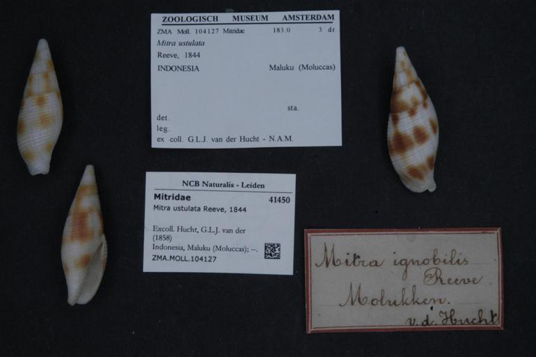 Keywords: Naturalis Biodiversity Center - ZMA.MOLL.104127 - Mitra ustulata Reeve, 1844 - Mitridae - Mollusc shell.jpeg artwork Dimensions artwork Document type Mitridae subfamily Mitrinae Mitra Individual count Infraspecific epithet Infraspecific rank Institution Naturalis Kind of unit artwork Kind of unit specimen shell Life stage Indonesia Maluku Moluccas Medium artwork Nomenclatural code Collection remarks Moll Scale the width of the text on the species/QR-code label is 38 mm Occurrence ID page Neogastropoda Other fields Other versions artwork Permission license Naturalis donation CC-0 Mollusca Publication location Scientific name Mitra ustulata Reeve 1844 Scientific name authorship Reeve 1844 Source url http //bioportal naturalis nl Specific epithet ustulata State or province Maluku Moluccas Subject keywords artwork Subject keywords publication Title artwork Title publication Type status Uploaded with GWToolset Naturalis_Biodiversity_Center_-_ZMA MOLL 104127_-_Mitra_ustulata_Reeve _1844_-_Mitridae_-_Mollusc_shell http //medialib naturalis nl/file/id/ZMA MOLL 104127/format/large Media donated by Naturalis Biodiversity Center Molluscs at Naturalis from the Zoölogisch Museum Amsterdam Mitra ustulata |