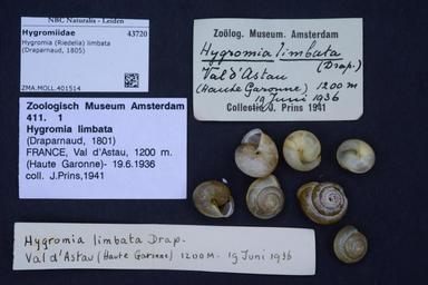 | Keywords: Naturalis Biodiversity Center - ZMA.MOLL.401514 - Hygromia (Riedelia) limbata (Draparnaud, 1805) - Hygromiidae - Mollusc shell.jpeg artwork Dimensions artwork Document type Hygromiidae subfamily Hygromiinae Hygromia Individual count Infraspecific epithet Infraspecific rank Institution Naturalis Kind of unit artwork Kind of unit specimen shell Life stage Medium artwork Nomenclatural code Source institute Rijksmuseum van Natuurlijke Historie Leiden Scale the width of the text on the species/QR-code label is 38 mm Occurrence ID page Other fields Other versions artwork Permission license Naturalis donation CC-0 Mollusca Publication location Scientific name Hygromia Riedelia limbata Draparnaud 1805 Scientific name authorship Draparnaud 1805 Source url http //bioportal naturalis nl Specific epithet limbata State or province Subject keywords artwork Subject keywords publication Title artwork Title publication Type status Uploaded with GWToolset Naturalis_Biodiversity_Center_-_ZMA MOLL 401514_-_Hygromia_ Riedelia _limbata_ Draparnaud _1805 _-_Hygromiidae_-_Mollusc_shell http //medialib naturalis nl/file/id/ZMA MOLL 401514/format/large Molluscs at Naturalis from the Zoölogisch Museum Amsterdam Media donated by Naturalis Biodiversity Center Hygromia limbata Hygromia |