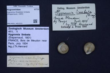 | Keywords: Naturalis Biodiversity Center - ZMA.MOLL.401523 - Hygromia (Riedelia) limbata (Draparnaud, 1805) - Hygromiidae - Mollusc shell.jpeg artwork Dimensions artwork Document type Hygromiidae subfamily Hygromiinae Hygromia Individual count Infraspecific epithet Infraspecific rank Institution Naturalis Kind of unit artwork Kind of unit specimen shell Life stage Medium artwork Nomenclatural code Source institute Rijksmuseum van Natuurlijke Historie Leiden Scale the width of the text on the species/QR-code label is 38 mm Occurrence ID page Other fields Other versions artwork Permission license Naturalis donation CC-0 Mollusca Publication location Scientific name Hygromia Riedelia limbata Draparnaud 1805 Scientific name authorship Draparnaud 1805 Source url http //bioportal naturalis nl Specific epithet limbata State or province Subject keywords artwork Subject keywords publication Title artwork Title publication Type status Uploaded with GWToolset Naturalis_Biodiversity_Center_-_ZMA MOLL 401523_-_Hygromia_ Riedelia _limbata_ Draparnaud _1805 _-_Hygromiidae_-_Mollusc_shell http //medialib naturalis nl/file/id/ZMA MOLL 401523/format/large Molluscs at Naturalis from the Zoölogisch Museum Amsterdam Media donated by Naturalis Biodiversity Center Hygromia limbata Hygromia |