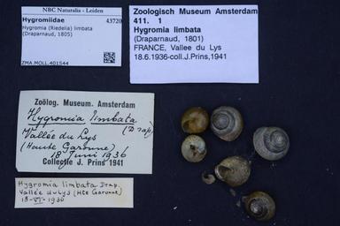 | Keywords: Naturalis Biodiversity Center - ZMA.MOLL.401544 - Hygromia (Riedelia) limbata (Draparnaud, 1805) - Hygromiidae - Mollusc shell.jpeg artwork Dimensions artwork Document type Hygromiidae subfamily Hygromiinae Hygromia Individual count Infraspecific epithet Infraspecific rank Institution Naturalis Kind of unit artwork Kind of unit specimen shell Life stage Medium artwork Nomenclatural code Source institute Rijksmuseum van Natuurlijke Historie Leiden Scale the width of the text on the species/QR-code label is 38 mm Occurrence ID page Other fields Other versions artwork Permission license Naturalis donation CC-0 Mollusca Publication location Scientific name Hygromia Riedelia limbata Draparnaud 1805 Scientific name authorship Draparnaud 1805 Source url http //bioportal naturalis nl Specific epithet limbata State or province Subject keywords artwork Subject keywords publication Title artwork Title publication Type status Uploaded with GWToolset Naturalis_Biodiversity_Center_-_ZMA MOLL 401544_-_Hygromia_ Riedelia _limbata_ Draparnaud _1805 _-_Hygromiidae_-_Mollusc_shell http //medialib naturalis nl/file/id/ZMA MOLL 401544/format/large Molluscs at Naturalis from the Zoölogisch Museum Amsterdam Media donated by Naturalis Biodiversity Center Hygromia limbata Hygromia |
