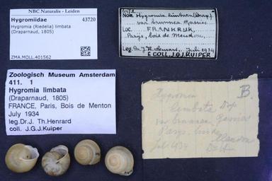 | Keywords: Naturalis Biodiversity Center - ZMA.MOLL.401562 - Hygromia (Riedelia) limbata (Draparnaud, 1805) - Hygromiidae - Mollusc shell.jpeg artwork Dimensions artwork Document type Hygromiidae subfamily Hygromiinae Hygromia Individual count Infraspecific epithet Infraspecific rank Institution Naturalis Kind of unit artwork Kind of unit specimen shell Life stage Medium artwork Nomenclatural code Source institute Rijksmuseum van Natuurlijke Historie Leiden Scale the width of the text on the species/QR-code label is 38 mm Occurrence ID page Other fields Other versions artwork Permission license Naturalis donation CC-0 Mollusca Publication location Scientific name Hygromia Riedelia limbata Draparnaud 1805 Scientific name authorship Draparnaud 1805 Source url http //bioportal naturalis nl Specific epithet limbata State or province Subject keywords artwork Subject keywords publication Title artwork Title publication Type status Uploaded with GWToolset Naturalis_Biodiversity_Center_-_ZMA MOLL 401562_-_Hygromia_ Riedelia _limbata_ Draparnaud _1805 _-_Hygromiidae_-_Mollusc_shell http //medialib naturalis nl/file/id/ZMA MOLL 401562/format/large Molluscs at Naturalis from the Zoölogisch Museum Amsterdam Media donated by Naturalis Biodiversity Center Hygromia limbata Hygromia |